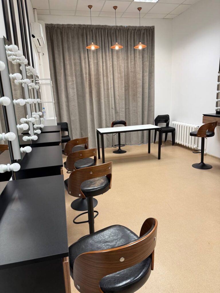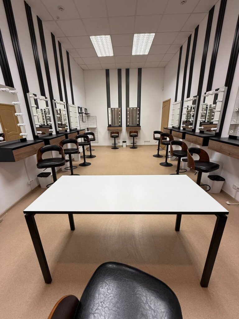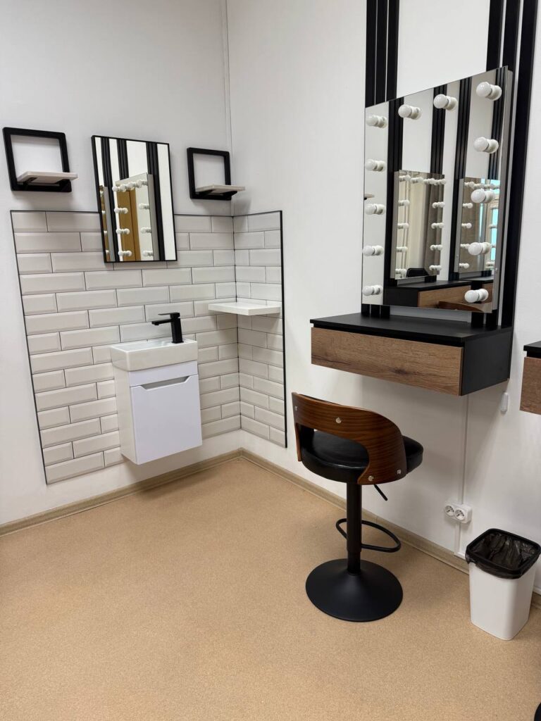 Гримёрное зеркало с регулируемой подсветкой, профессиональное кресло, кольцевая лампа, столик-органайзер, стерилизатор, Wi-Fi и зона для кофе/чая клиентов — всё уже в цене.